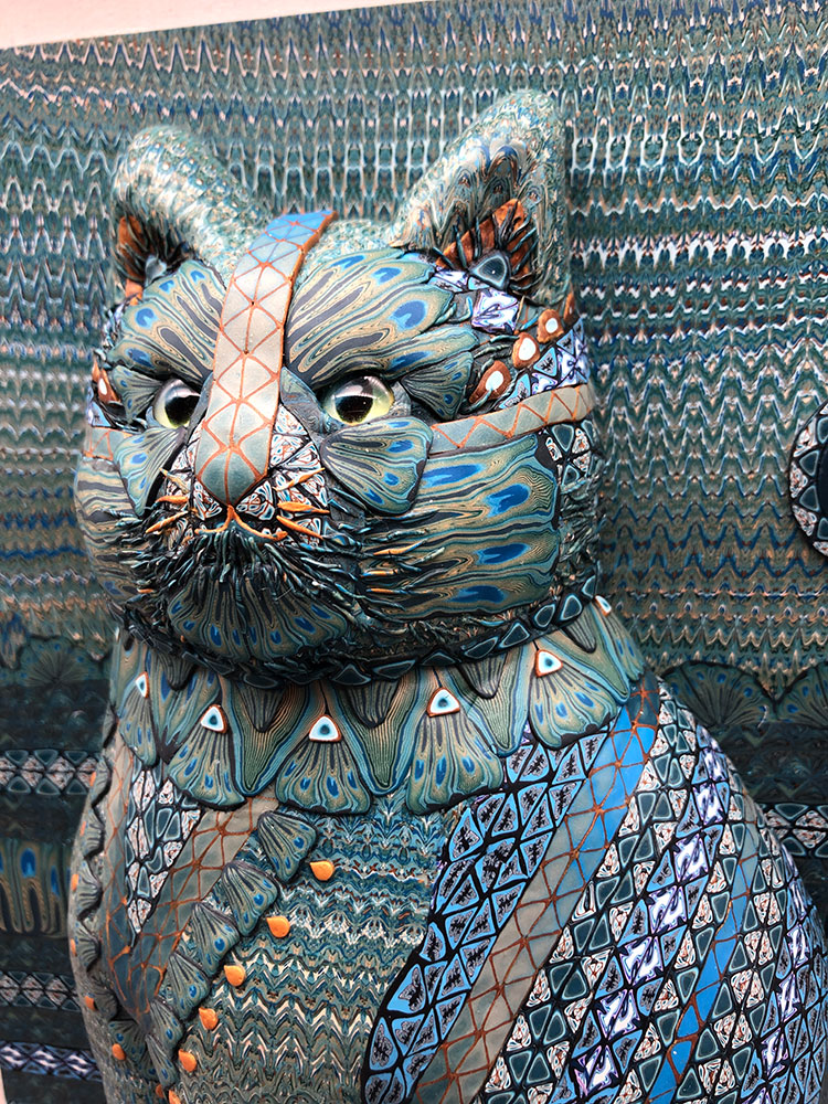 Peacock Kitty This original one of a kind piece is made of polymer clay. Color schemes are made by mixing colored clays into custom blends. Complex patterns are created through a variety of techniques including caning and building veneers into fabric-like sheets. The veneers and canes are carefully layered and fitted together to create each completely hand made and unique piece.